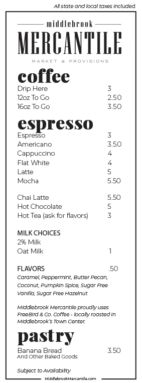 The Merc proudly brews small-batch beans from FreeBird & Co, out of Warren County, giving you rich and unique flavor lattes, cappuccinos, and coffee.